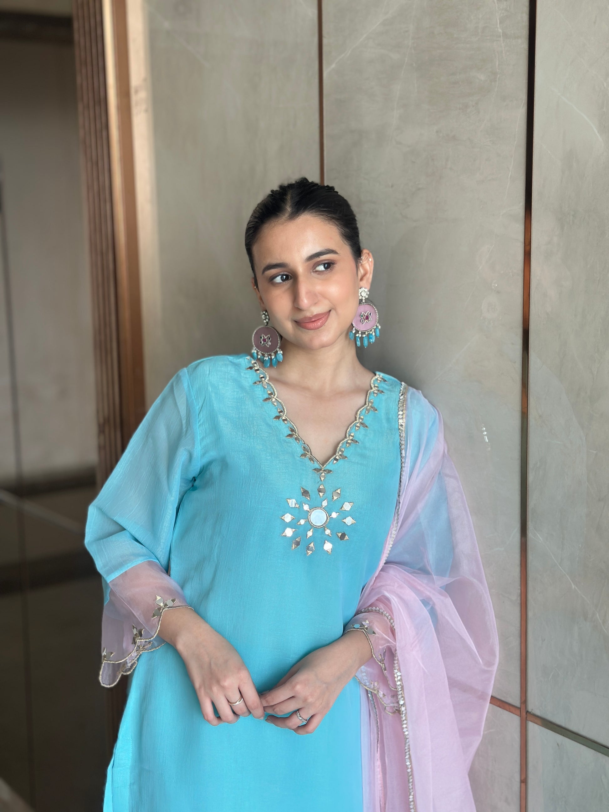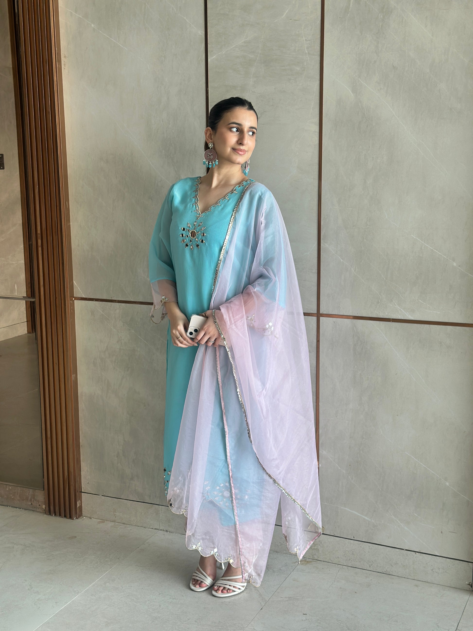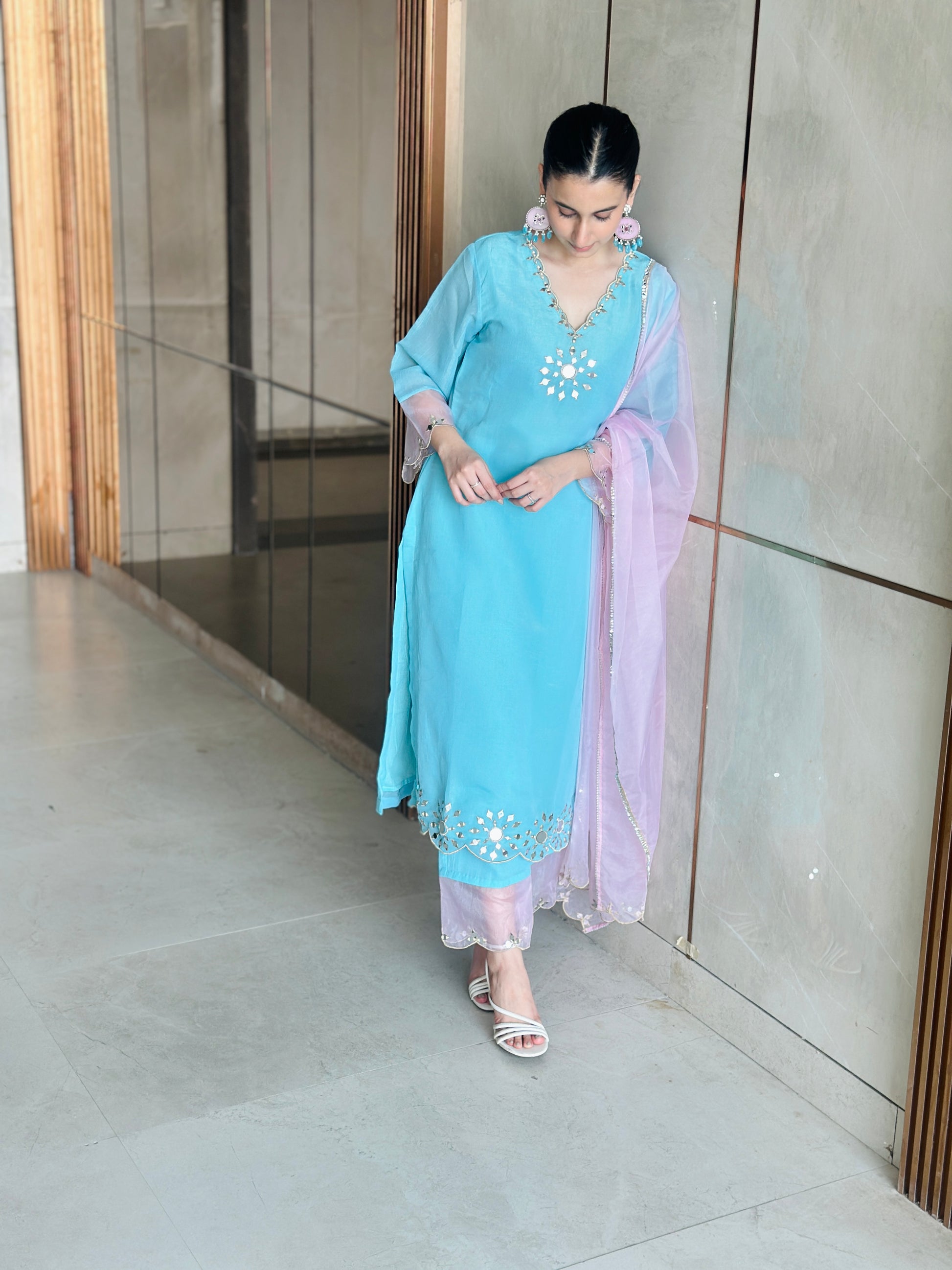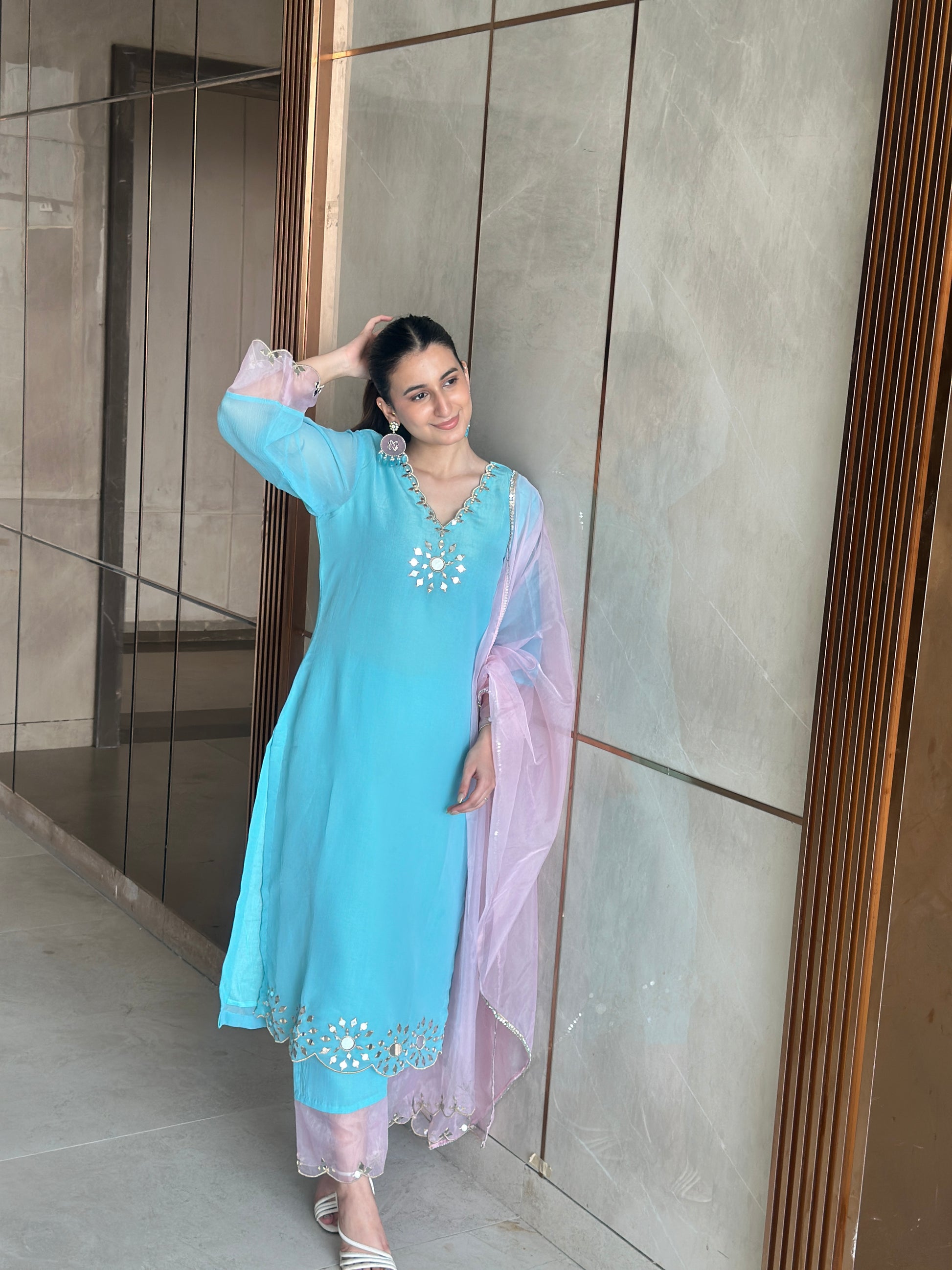تألقي بأناقة مع طقم بدلاتنا الحريرية المجروشة، المصمم ليُضفي لمسةً مميزةً على كل مناسبة احتفالية. مصنوع من الحرير المجروش الفاخر، بتفاصيل فضية لامعة في نسيج القماش، هذا الطقم المكون من ثلاث قطع ينضح بالرقي والأناقة. يضيف تصميم المرآة المتقن لمسةً من اللمعان، مما يجعله مثاليًا للاحتفالات وحفلات الزفاف والتجمعات الخاصة.