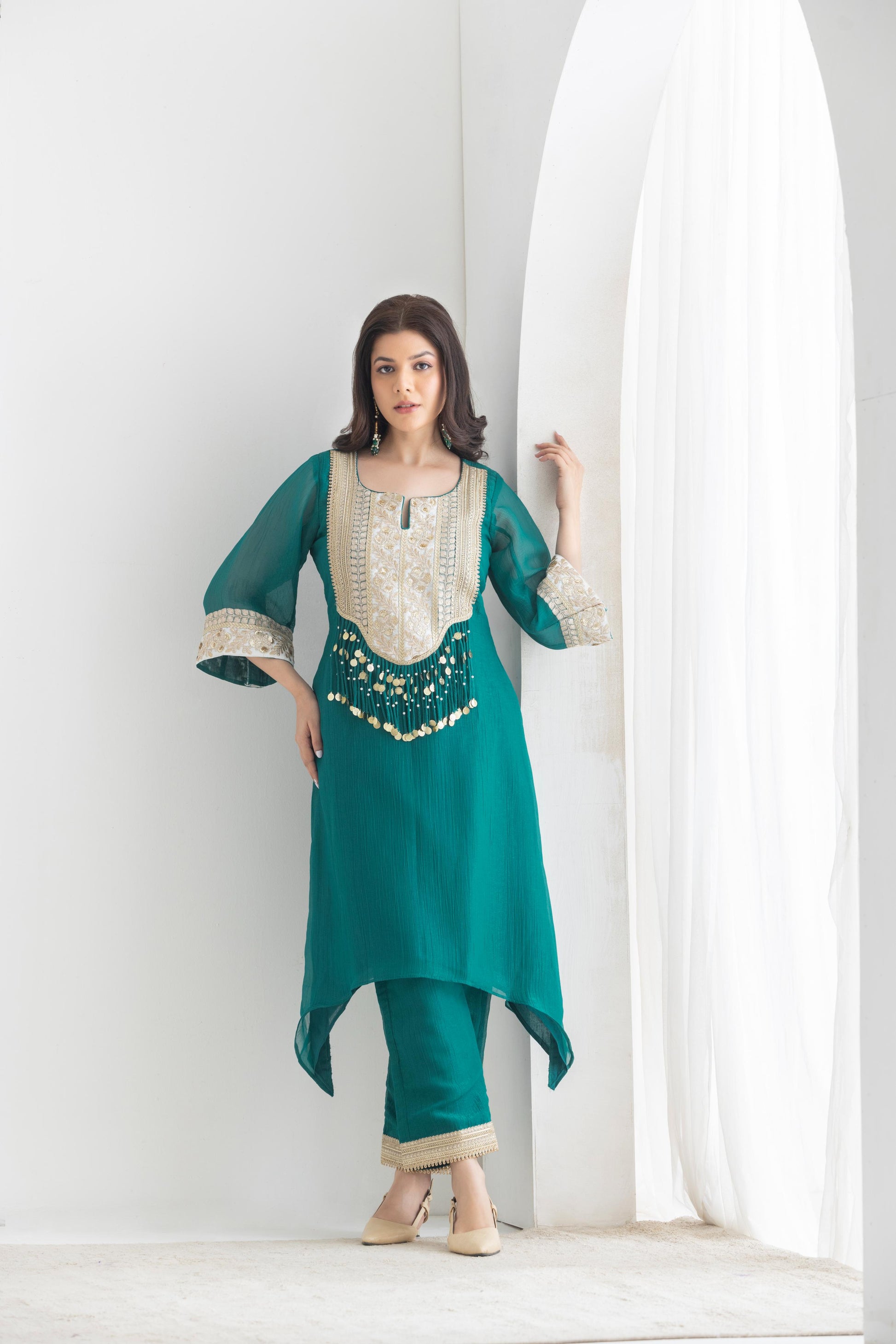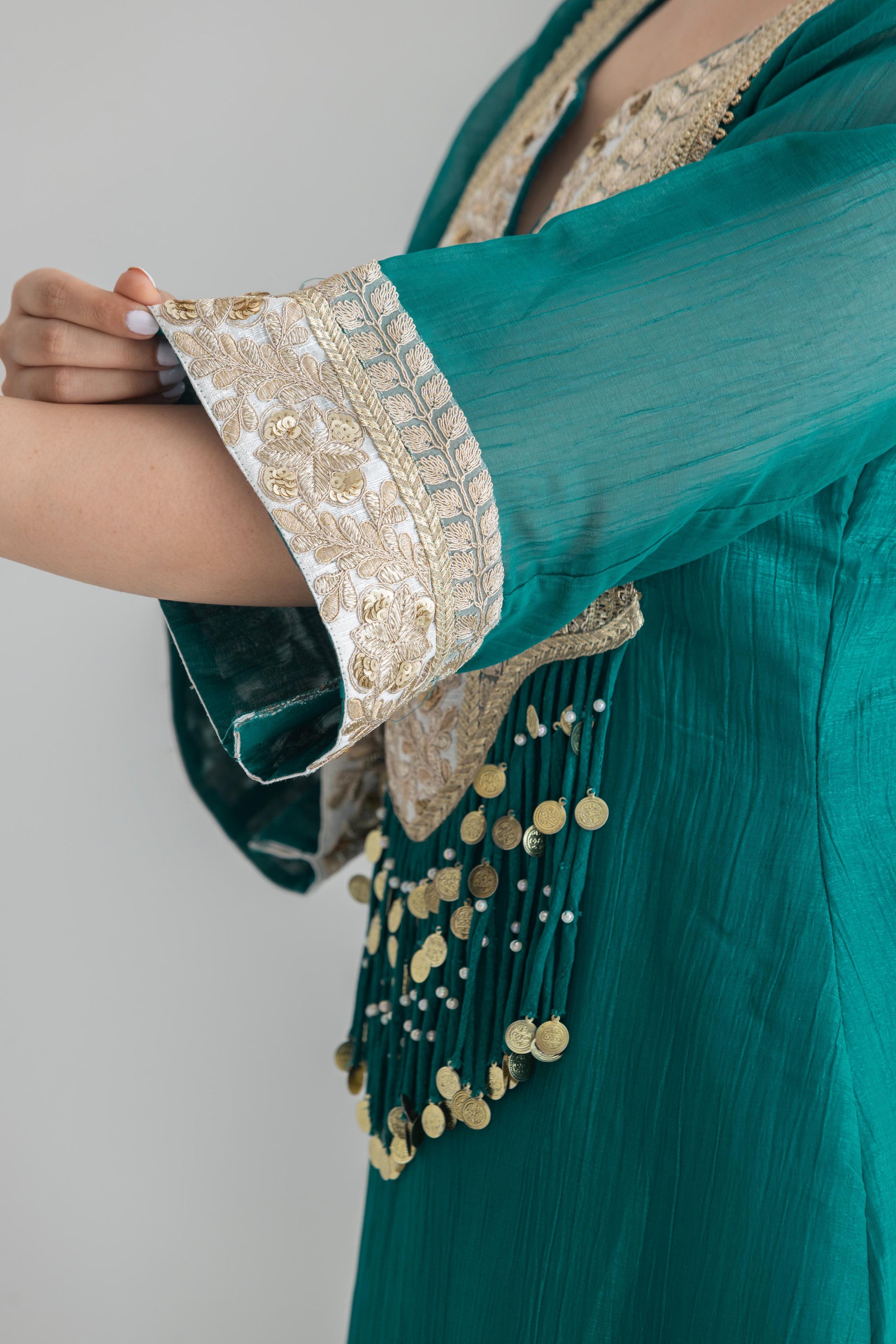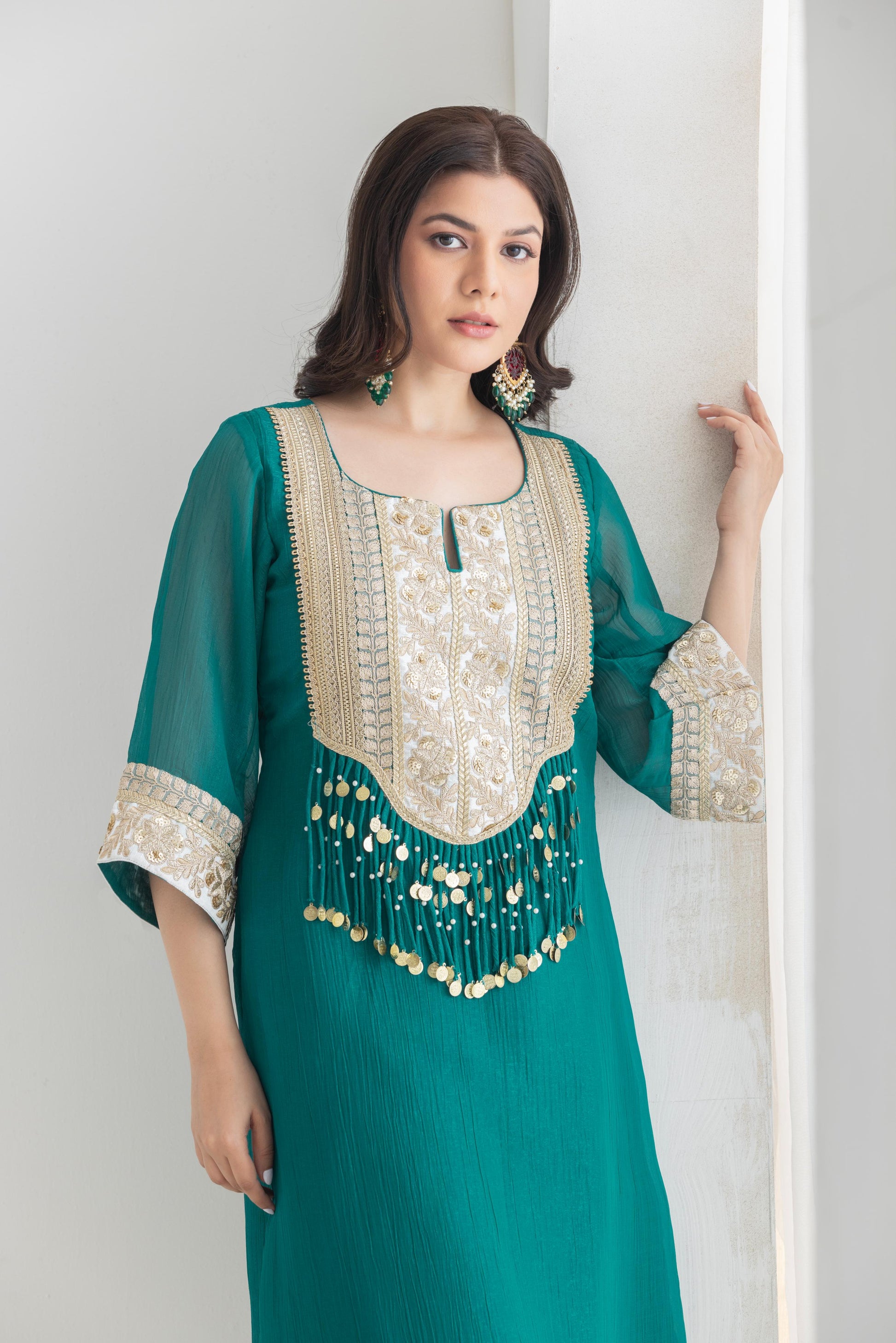 يمتزج الفخامة الترابية مع سحر العصر في طقم بدلات كاليدار الأنيق هذا. يتميز هذا الكورتا الفضفاض، المُصمم على طراز كاليدار، بلون ذهبي عتيق غني، بفتحة رقبة على شكل حرف V جذابة مزينة بتفاصيل دانتيل ذهبية رقيقة. يُنسّق هذا التصميم الفضفاض مع بنطال ضيق بلون وردي صدئ، مما يُضفي تباينًا جريئًا ولمسة نهائية منظمة على الطقم. يُكمل وشاح الأورجانزا الشفاف، المُحاط بدانتيل مُعقد، الإطلالة بلمسة من الأناقة الرقيقة. يُعد هذا الطقم مثاليًا للاحتفالات الخاصة، والسهرات الاحتفالية، أو التجمعات المسائية الأنيقة، فهو يُضفي لمسة من الرقي والبساطة.