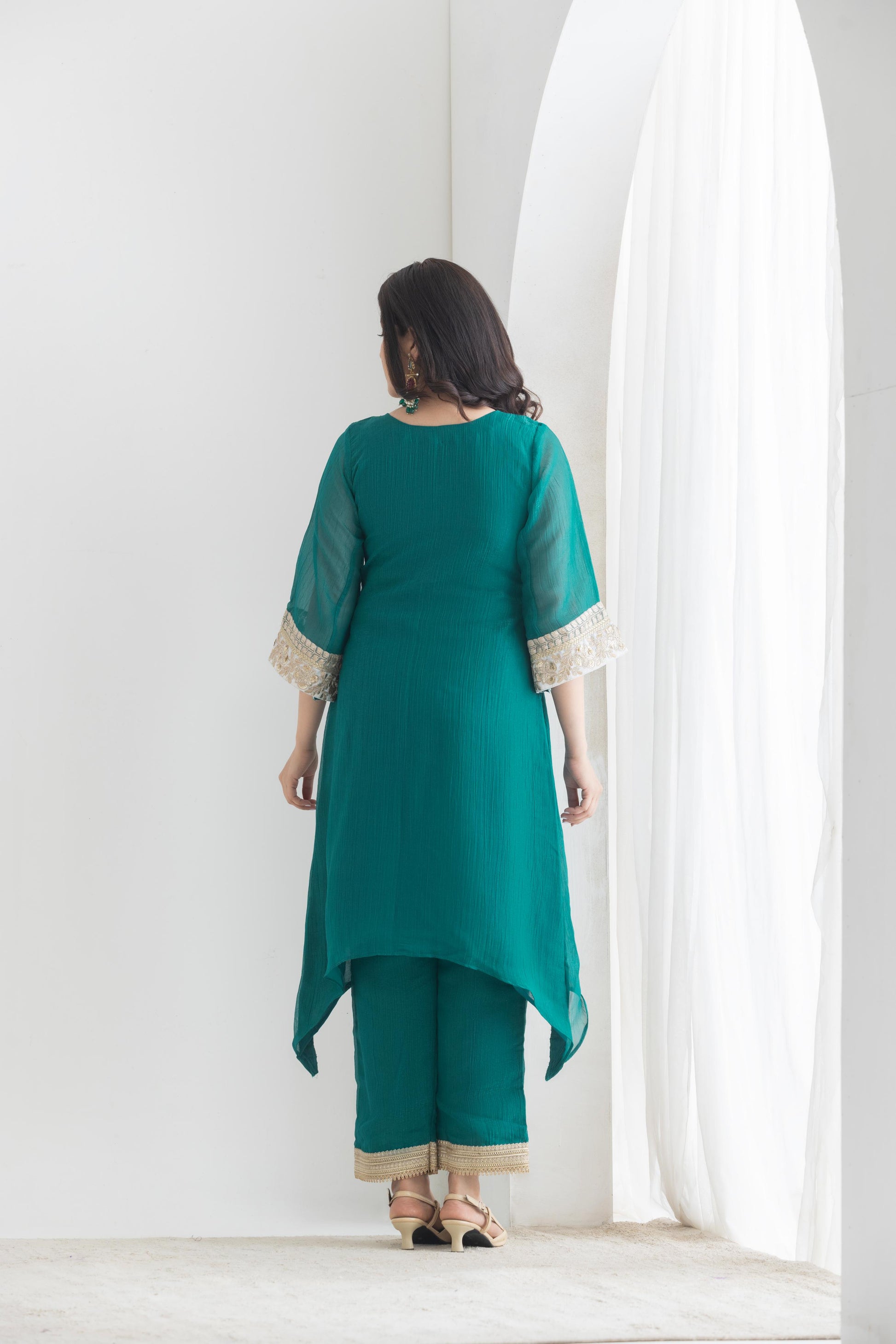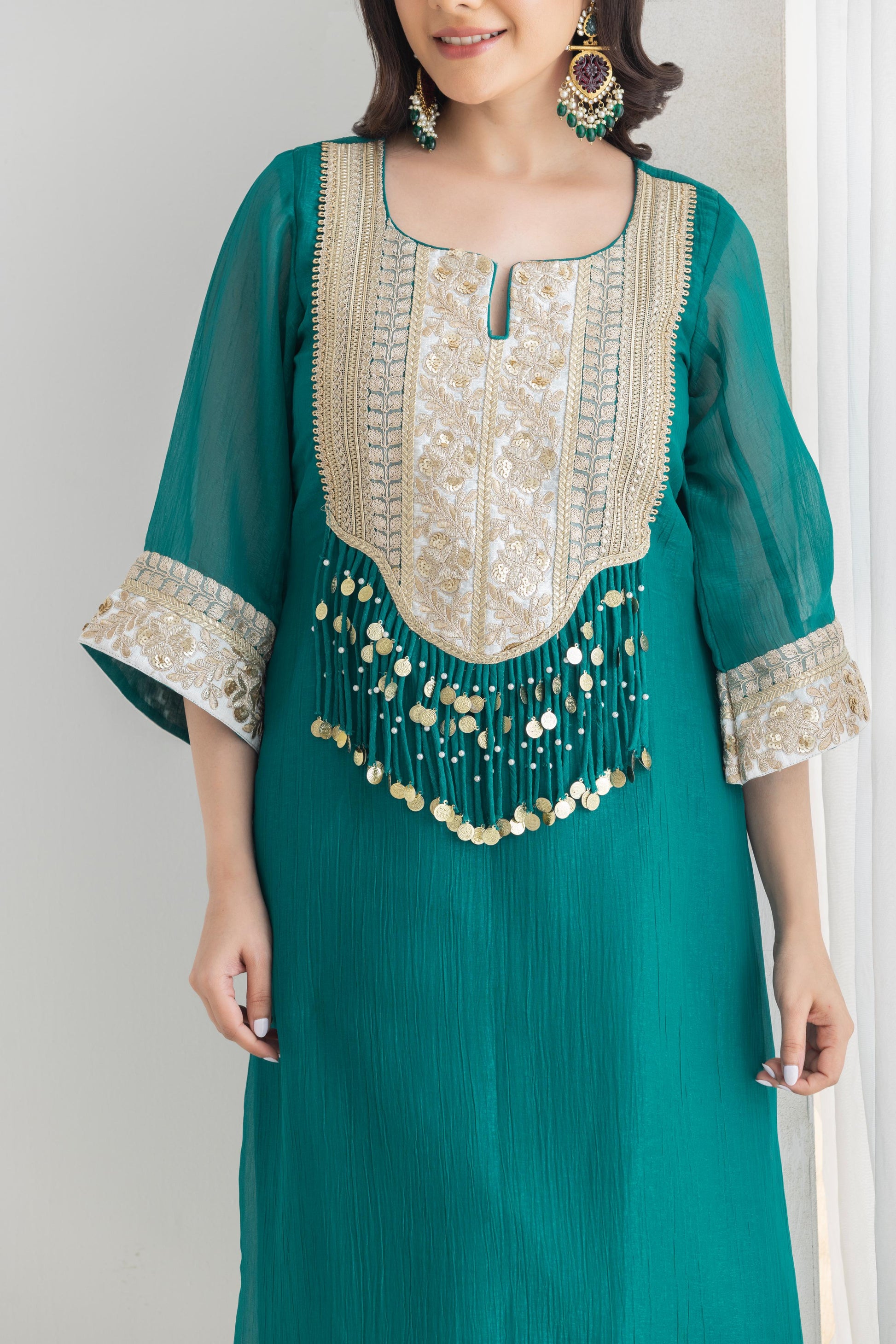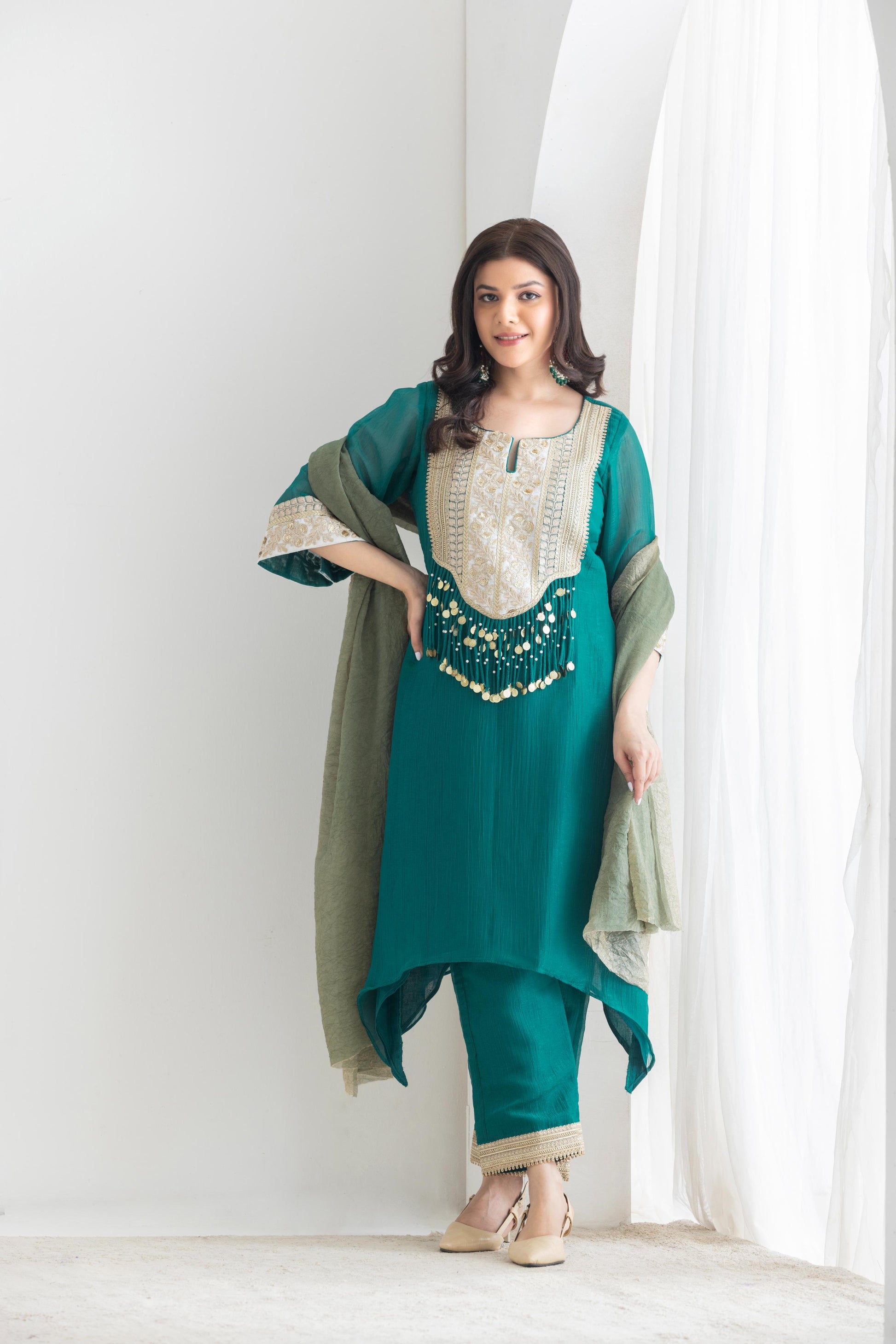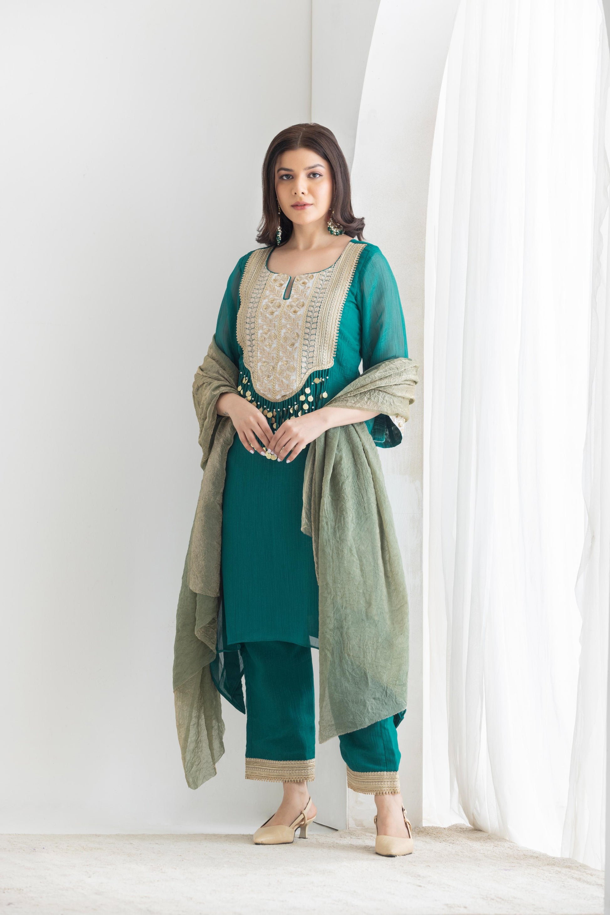 يمتزج الفخامة الترابية مع سحر العصر في طقم بدلات كاليدار الأنيق هذا. يتميز هذا الكورتا الفضفاض، المُصمم على طراز كاليدار، بلون ذهبي عتيق غني، بفتحة رقبة على شكل حرف V جذابة مزينة بتفاصيل دانتيل ذهبية رقيقة. يُنسّق هذا التصميم الفضفاض مع بنطال ضيق بلون وردي صدئ، مما يُضفي تباينًا جريئًا ولمسة نهائية منظمة على الطقم. يُكمل وشاح الأورجانزا الشفاف، المُحاط بدانتيل مُعقد، الإطلالة بلمسة من الأناقة الرقيقة. يُعد هذا الطقم مثاليًا للاحتفالات الخاصة، والسهرات الاحتفالية، أو التجمعات المسائية الأنيقة، فهو يُضفي لمسة من الرقي والبساطة.
