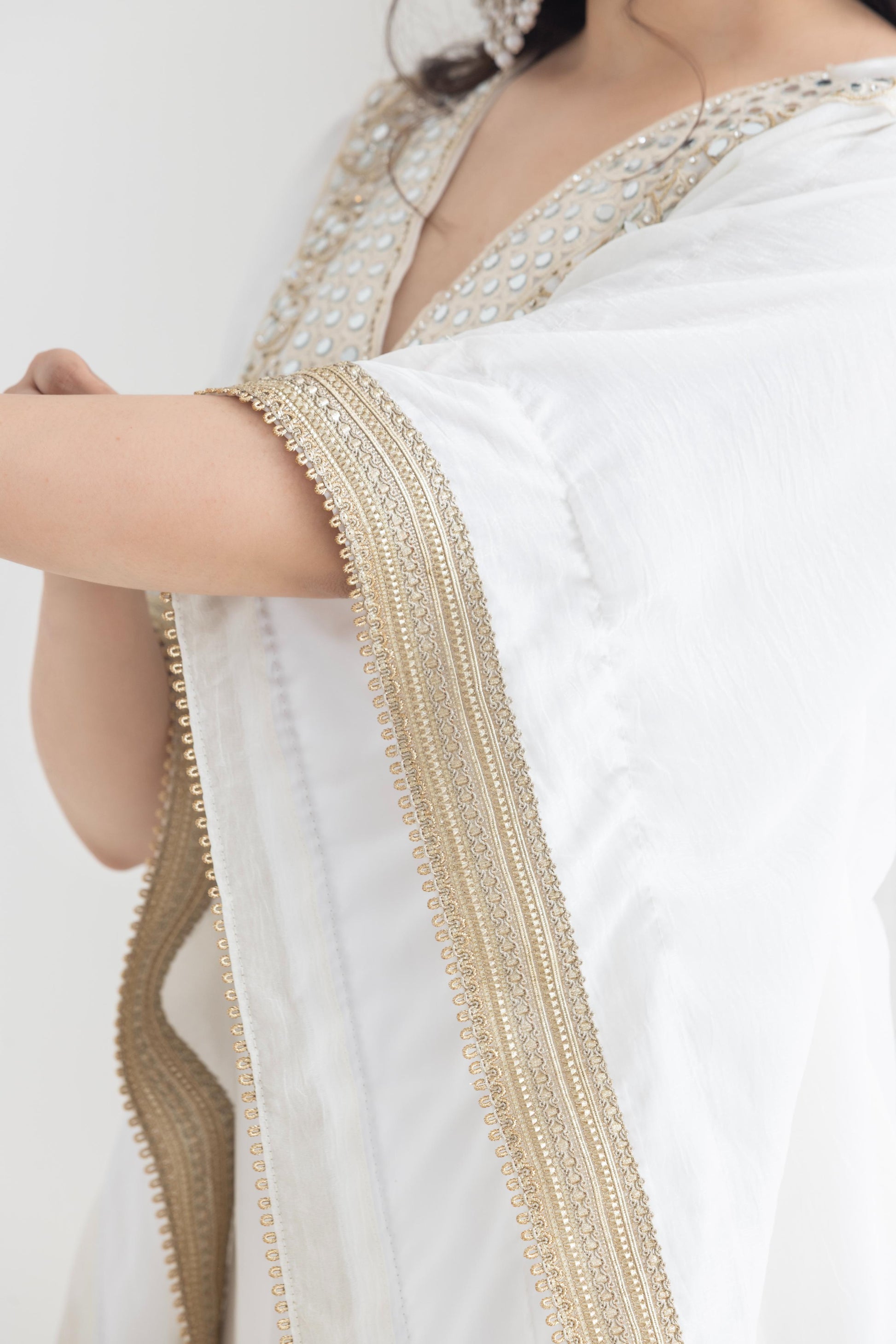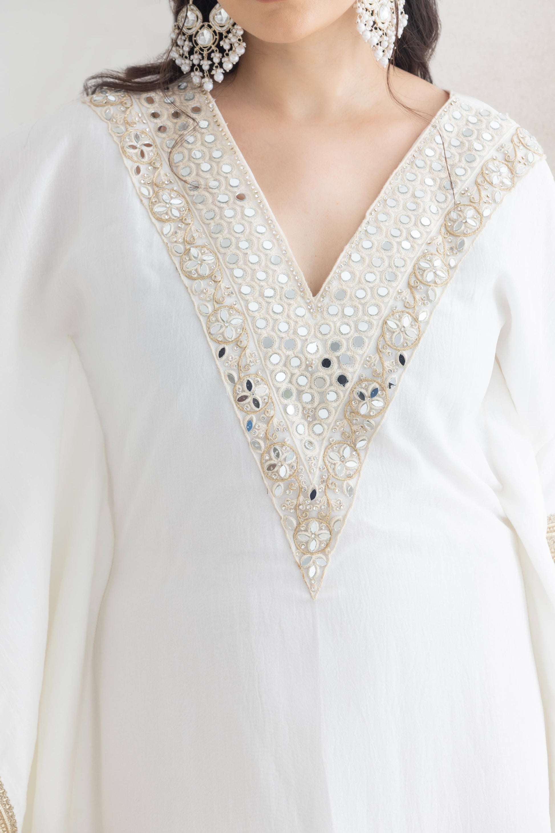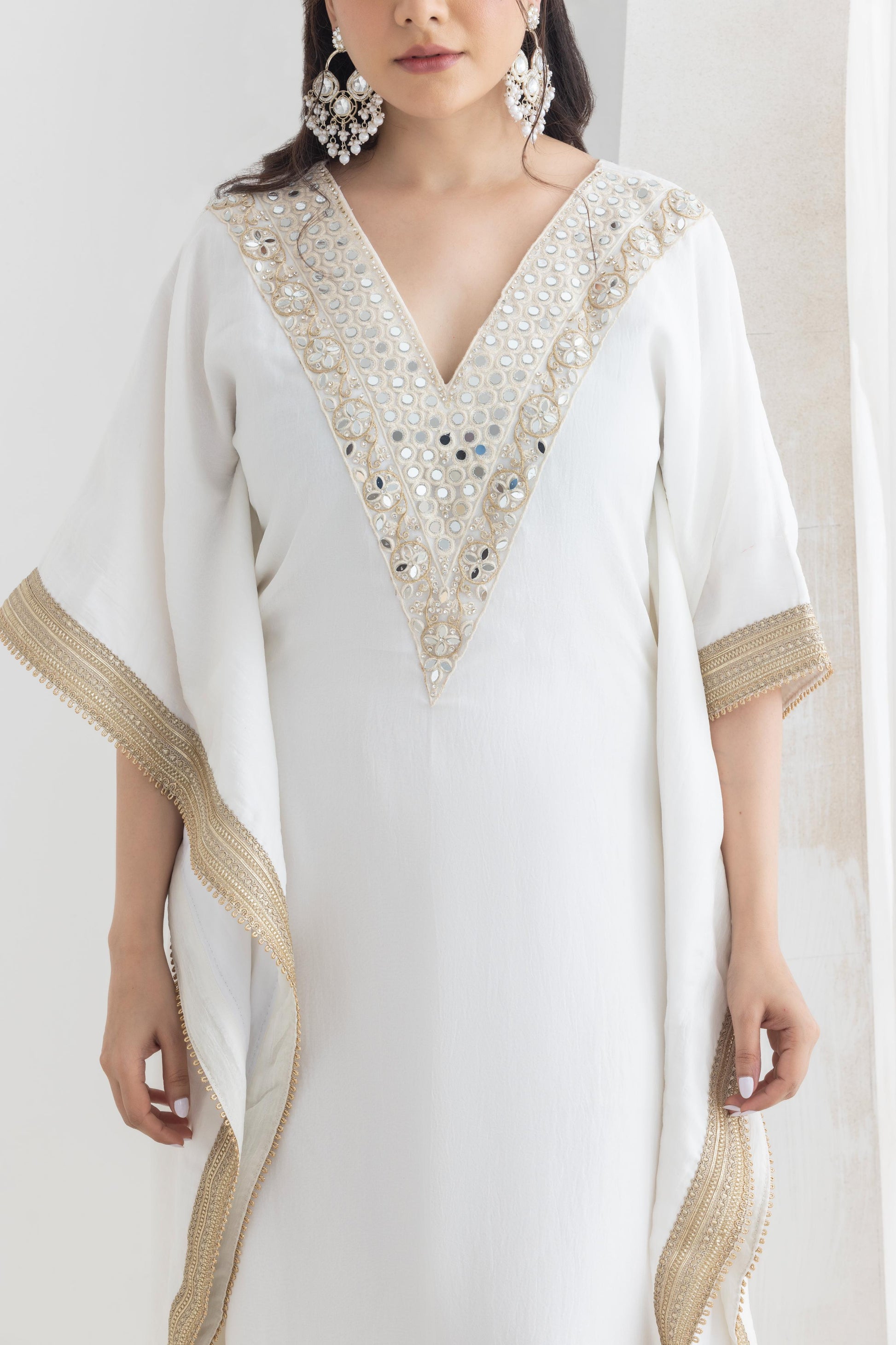 يمتزج الفخامة الترابية مع سحر العصر في طقم بدلات كاليدار الأنيق هذا. يتميز هذا الكورتا الفضفاض، المُصمم على طراز كاليدار، بلون ذهبي عتيق غني، بفتحة رقبة على شكل حرف V جذابة مزينة بتفاصيل دانتيل ذهبية رقيقة. يُنسّق هذا التصميم الفضفاض مع بنطال ضيق بلون وردي صدئ، مما يُضفي تباينًا جريئًا ولمسة نهائية منظمة على الطقم. يُكمل وشاح الأورجانزا الشفاف، المُحاط بدانتيل مُعقد، الإطلالة بلمسة من الأناقة الرقيقة. يُعد هذا الطقم مثاليًا للاحتفالات الخاصة، والسهرات الاحتفالية، أو التجمعات المسائية الأنيقة، فهو يُضفي لمسة من الرقي والبساطة.