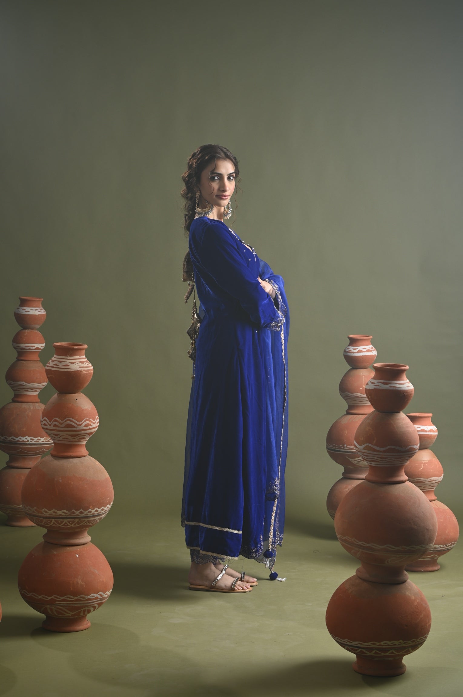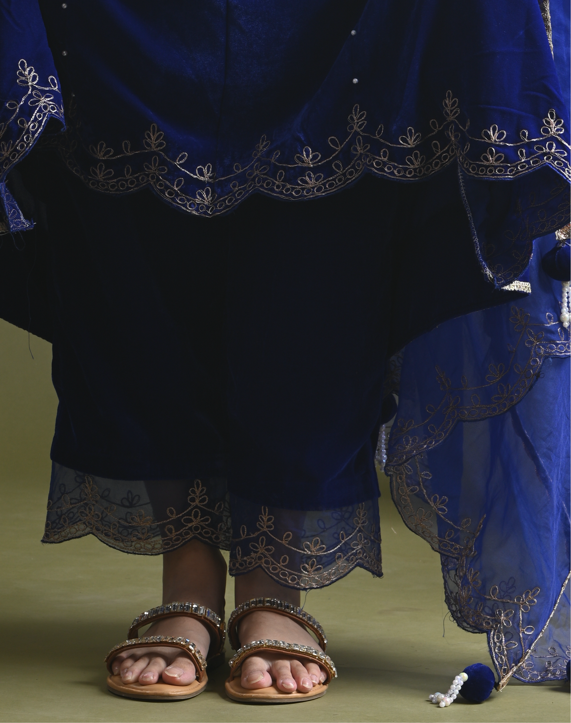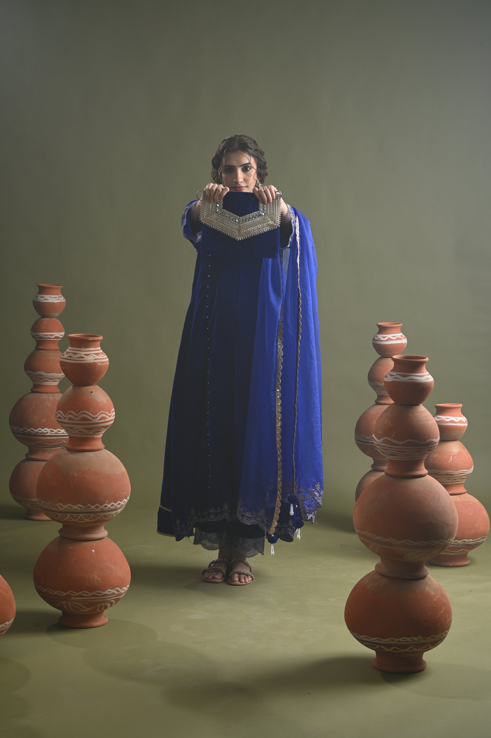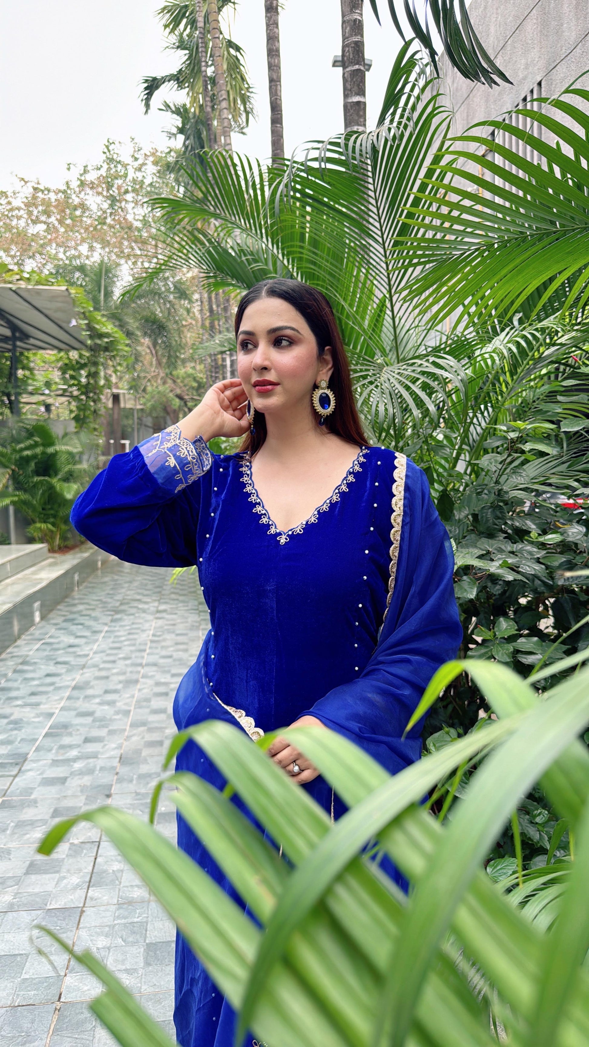 Cette superbe tenue traditionnelle se compose d'un ensemble de panneaux confectionnés dans un tissu en velours riche, accentué par des fils dori argentés complexes le long de l'encolure et des manches. La dupatta qui l'accompagne, confectionnée dans un tissu organza plus léger, est ornée de broderies délicates similaires, offrant un look harmonieux et royal. L'ensemble respire l'élégance avec ses détails subtils en perles faites à la main sur le panneau et sa coupe structurée, ce qui en fait un choix parfait pour les occasions festives ou les événements officiels. Ce look allie confort et style intemporel.