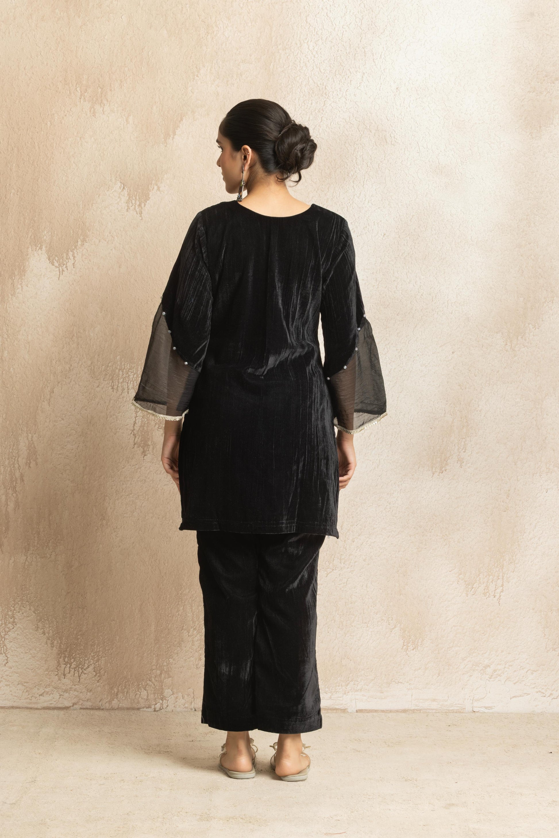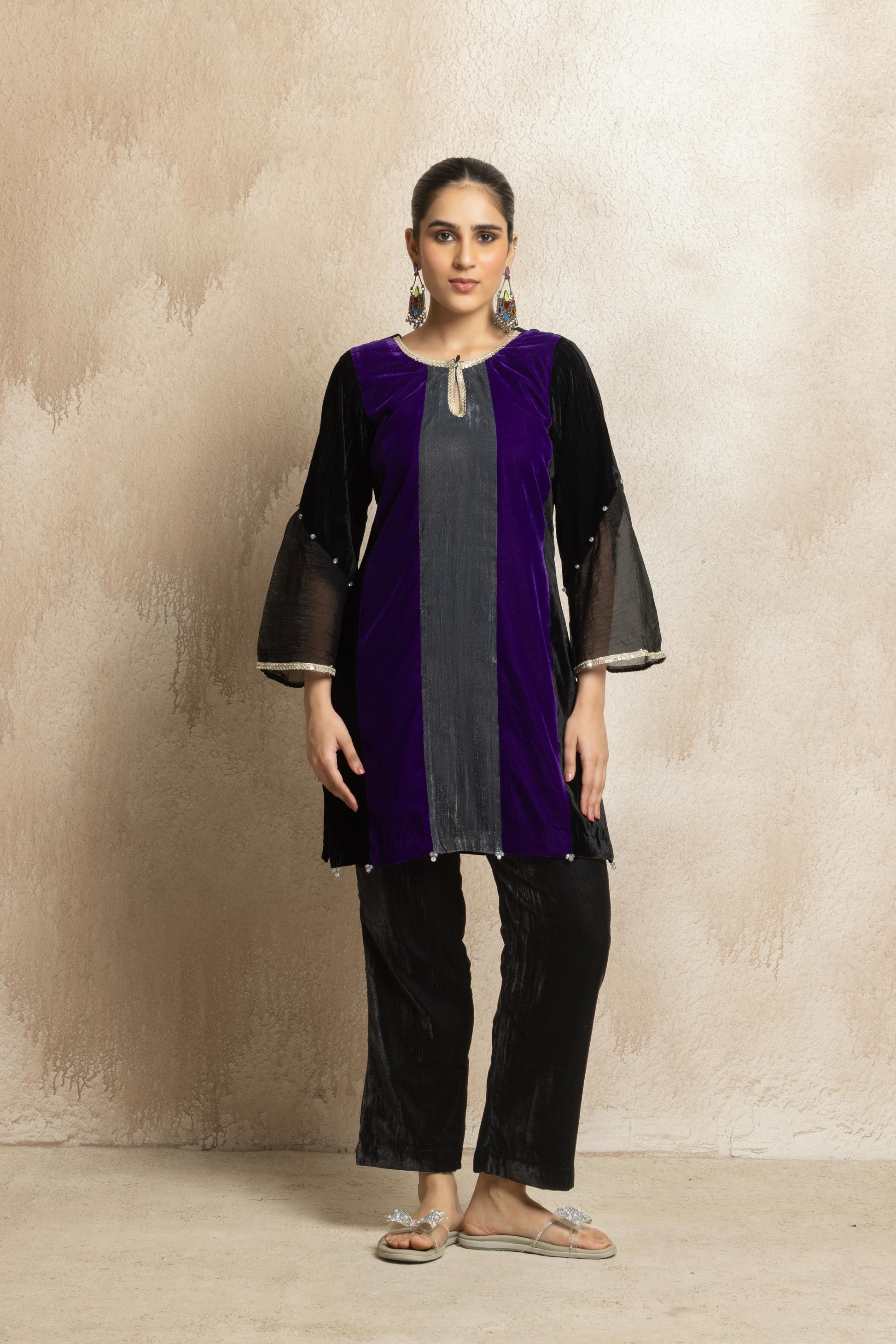 A beautiful blend of deep purple and soft grey, this velvet kurta set radiates chic sophistication. Pearl detailing on the sleeves brings a refined touch, while the sleek black pants add sharp contrast. Perfect for evening functions, small gatherings, or winter festivities.