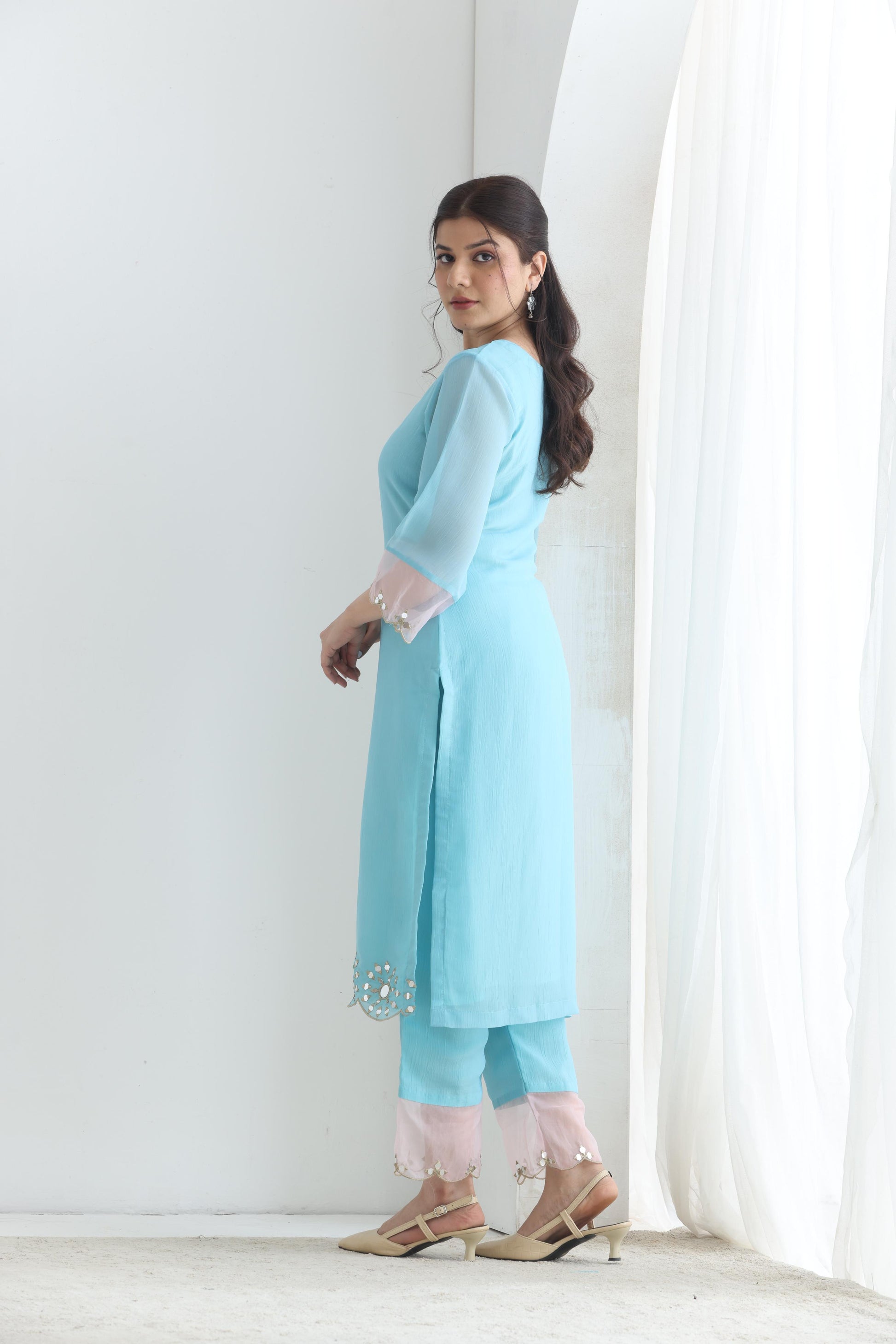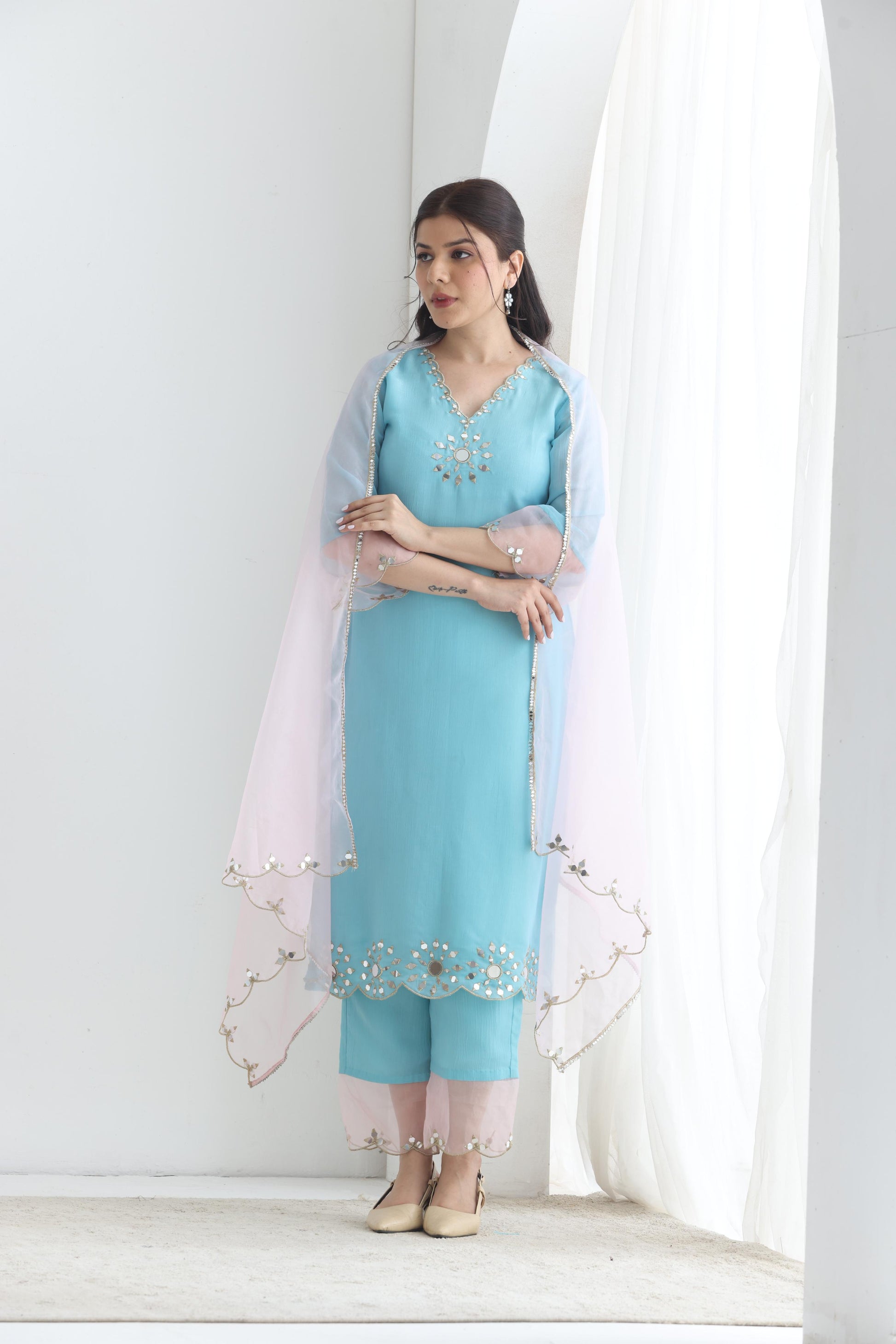 Drape yourself in elegance with our Crushed Silk Suit Set, designed to make a statement at every festive occasion. Crafted from luxurious crushed silk with hinge of sliver shine in the weave of the fabric, this three-piece ensemble exudes grace and sophistication. The intricate mirror work adds a touch of shimmer, making it perfect for celebrations, weddings, and special gatherings.