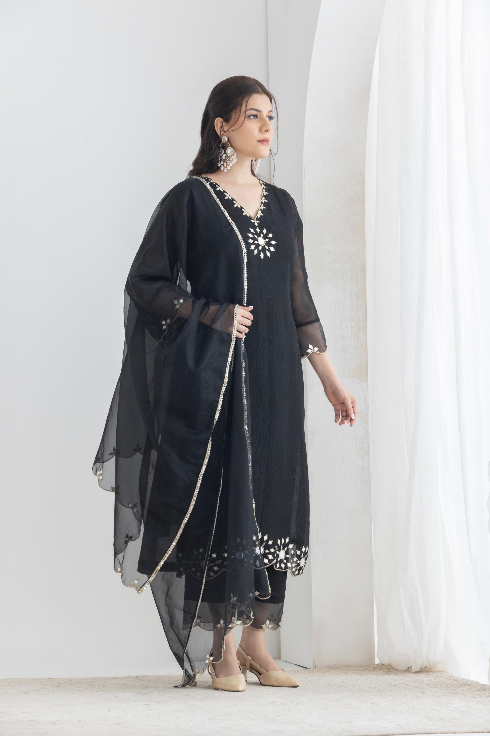 Drape yourself in elegance with our Crushed Silk Suit Set, designed to make a statement at every festive occasion. Crafted from luxurious crushed silk with hinge of sliver shine in the weave of the fabric, this three-piece ensemble exudes grace and sophistication. The intricate mirror work adds a touch of shimmer, making it perfect for celebrations, weddings, and special gatherings.
