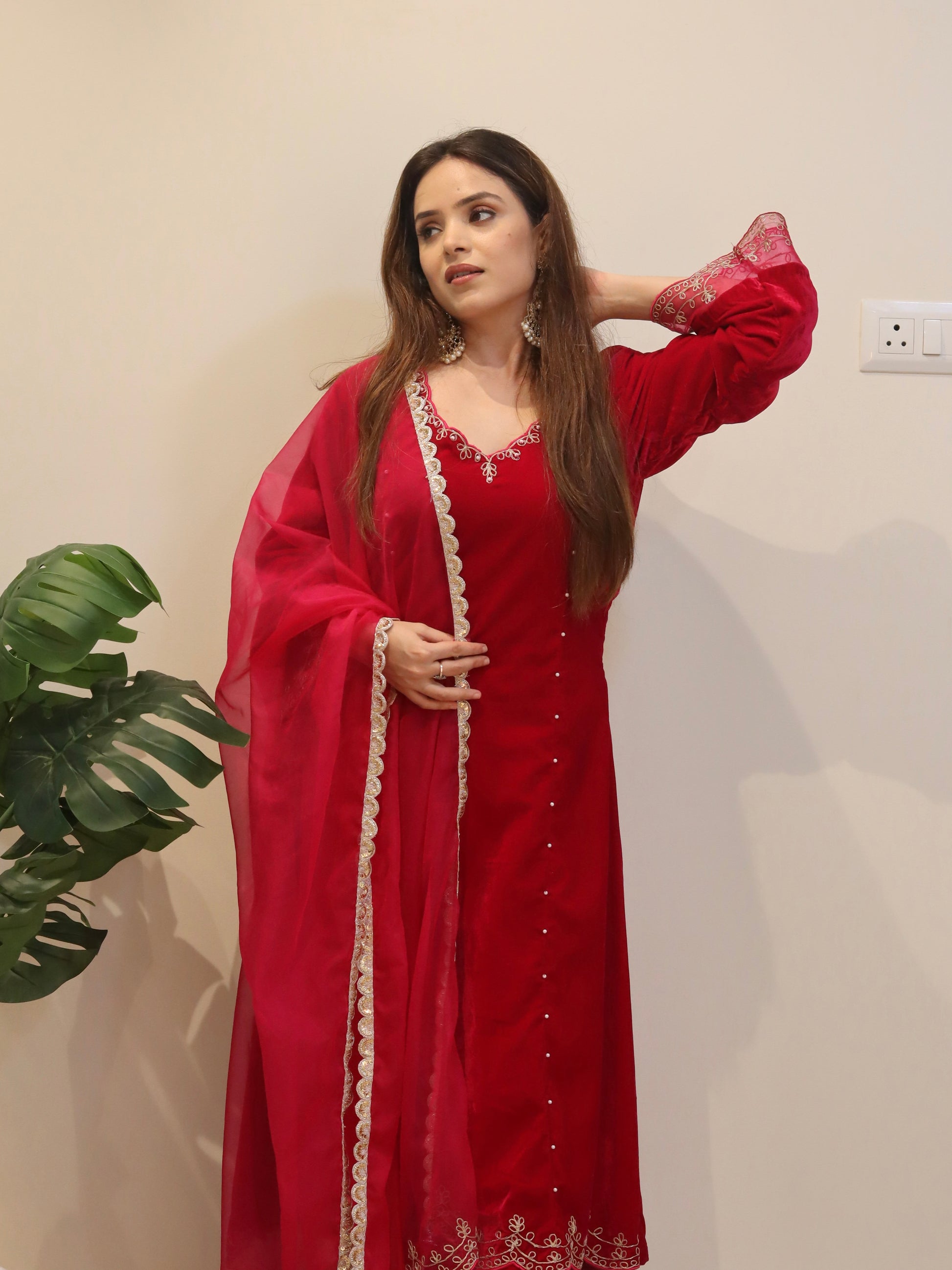 Great Offers awaits on Check-out page. T&CThis stunning traditional outfit features panel set crafted from rich velvet fabric, accentuated with intricate silver dori threadwork along the neckline and sleeves. The accompanying dupatta, made from a lighter organza fabric, is adorned with similar delicate embroidery, providing a harmonious, regal look. The ensemble exudes elegance with its subtle pearl hand detailing on panel and structured fit, making it a perfect choice for festive occasions or formal events. This look combines comfort with timeless style.